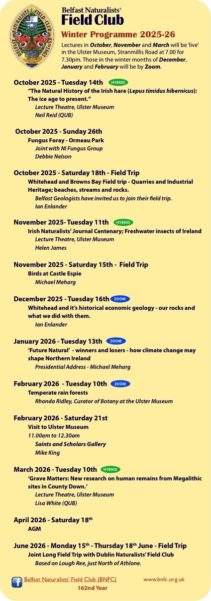 We also run a series of evening Winter Lectures usually on the 2nd Tuesday of the month in the lecture theatre at the Ulster Museum, Stranmillis in Belfast.
