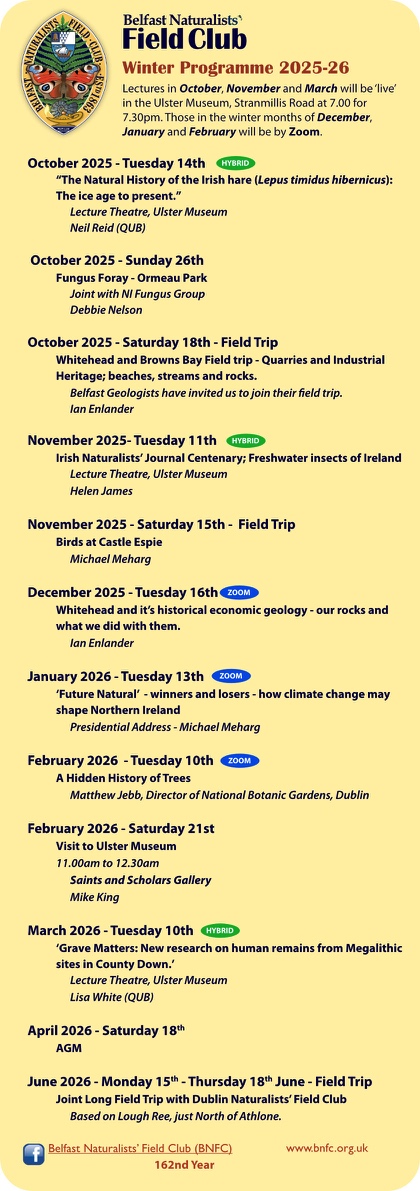 We also run a series of evening Winter Lectures usually on the 2nd Tuesday of the month in the lecture theatre at the Ulster Museum, Stranmillis in Belfast.